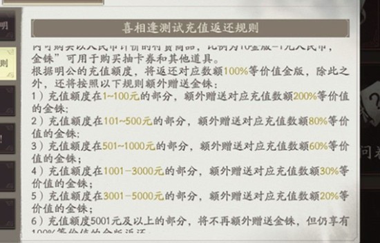 返还规则分为固定返还和额外赠送两部分。首次充值可获得100%金版返还,例如充值100元得1000金版,充值198元得1980金版。额外赠送的金铢则按充值金额分档计算:充值1-100元额外赠送200%金铢,101-500元赠送80%,501-1000元赠送60%,超过5001元不再额外赠送。
