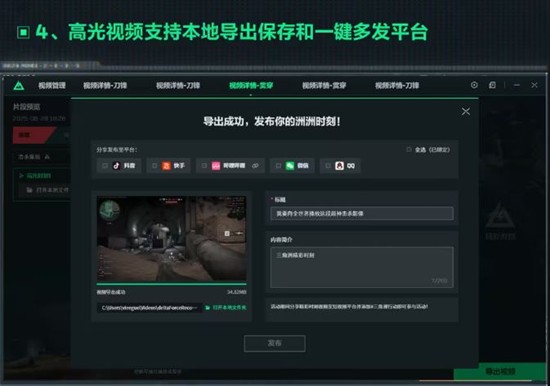 洲洲时刻工具的优势在于其强大的功能支持和用户友好的操作界面。它不仅支持高光视频的模板渲染,还支持本地导出保存和一键多发平台,极大地方便了玩家分享精彩时刻。此外,工具还提供了自动删除功能,当存储空间达到设定的内存上限时,系统会自动删除旧的视频文件,确保存储空间的有效利用。