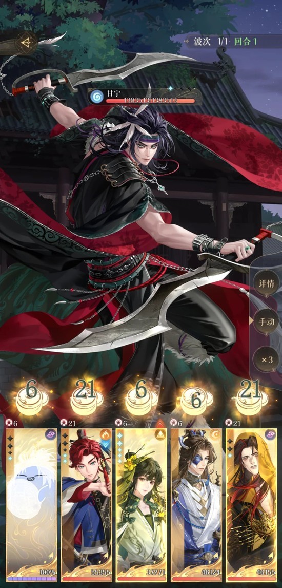 进度参考:遗迹5甘宁有3条命,孙权10回合能叠免伤到-1,我的练度16回合进3阶段,25回合结束。