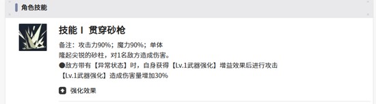 亚雷克德拉的核心技能之一是贯穿砂枪,基础攻击力和魔力值加成均为90%,属于单体输出技能。释放时会召唤尖锐沙柱对目标造成伤害,若敌方处于异常状态,亚雷克德拉还能获得武器强化效果,提升后续30%的攻击伤害。这一机制让他在面对已被施加减益的敌人时更具威胁,配合队友的异常状态施加能力可有效提升整体输出节奏。