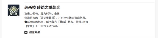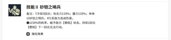 另一个技能砂铠之哨兵每三回合可释放一次,攻击力与魔力加成提升至110%,同样是单体攻击技能。除了更高的基础数值外,该技能还附带50%概率的晕眩效果,持续一回合。这一控制效果能有效打断敌方关键技能释放,尤其在对抗高爆发或连锁技能的敌人时具有战略意义,为队伍争取更多操作空间。