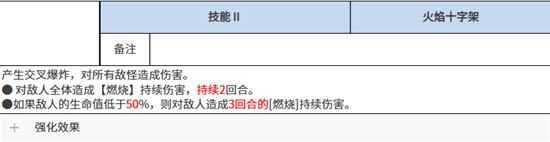 特莱吉亚的第二个主动技能是火焰十字架,释放时形成交叉状的爆炸范围,覆盖场上多个敌方单位,属于典型的群体伤害技能。此技能不仅基础伤害可观,还有概率触发额外的燃烧效果。一旦成功施加燃烧,所有被命中的敌人都会受到持续伤害,持续时间为两回合;若目标生命值低于50%,则燃烧时间延长至三回合。这意味着在战斗后期,特莱吉亚能有效压制残血敌人,提升整体清场效率。