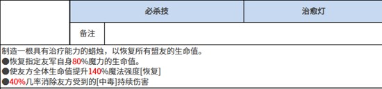 她的必杀技“治愈灯”展现了其辅助价值。发动时会召唤一根发光蜡烛,为所有队友恢复一定生命值。恢复量依据每位友军所拥有的魔力值百分比进行换算,最高可按80%魔力值转化为生命回复。与此同时,受治疗的单位还将获得140%的魔法强度提升,持续一段时间。这使得她在团战中不仅能维持队伍生存,还能显著增强后续一轮的爆发输出能力。