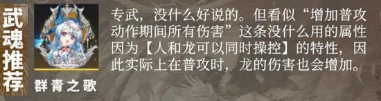 伊莱莎适合搭配群青之歌武魂。该武魂专注于强化普通攻击的伤害与连击收益。伊莱莎的战斗风格包含多段普攻衔接技能的模式,在不同形态切换下普攻动作有所变化,群青之歌能覆盖其所有形态下的基础攻击加成。即使在技能冷却期间,也能依靠普攻维持输出节奏,使整体DPS更加稳定。