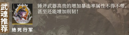 克拉拉作为锤斧类近战角色,推荐使用绝死行军武魂。该武魂提供高额爆发伤害加成,并附带削弱敌人韧性条的效果。克拉拉的技能多用于破防与控场,绝死行军能增强其打断能力,使其在面对高韧性敌人时更具威胁。同时,该武魂在生命值较低时还能提供额外增益,适合激进打法的角色使用。