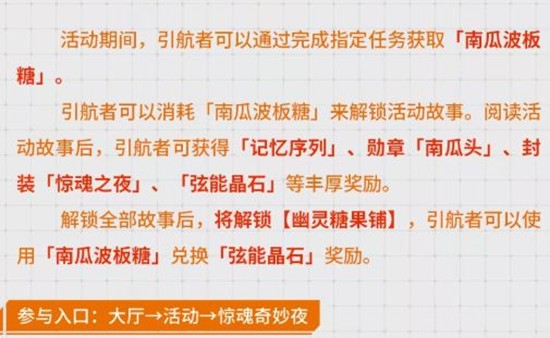引航者可以消耗「南瓜波板糖」来解锁活动故事。阅读这些精彩的故事后,你将获得「记忆序列」、勋章「南瓜头」、封装「惊魂之夜」、「弦能晶石」等丰厚奖励。这些奖励不仅能提升你的游戏体验,还能让你在万圣节的狂欢中脱颖而出。