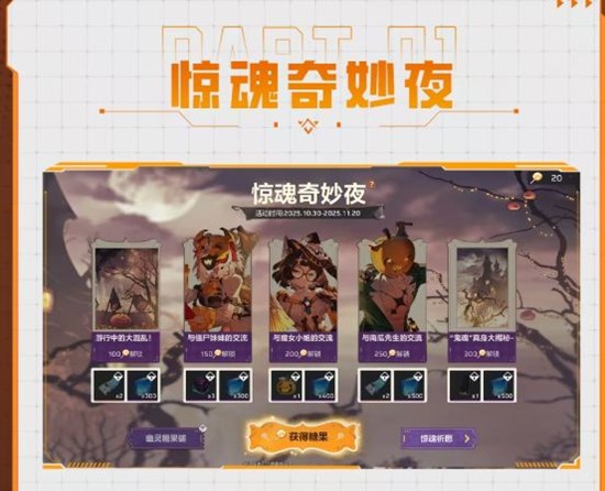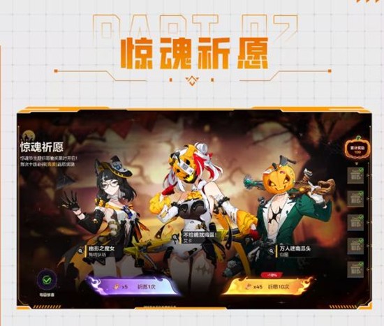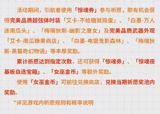 活动期间,引航者使用「惊魂券」参与祈愿,即有机会获得完美品质超弦体时装「艾卡-不给糖就捣蛋」、「白墨-万人迷南瓜头」、「梅瑞狄斯-幽影之魔女」及完美品质武器外观「艾卡-南瓜糖果商店」、「白墨-电锯鬼影森林」、「梅瑞狄斯-黑猫奇幻物语」等丰厚奖励。