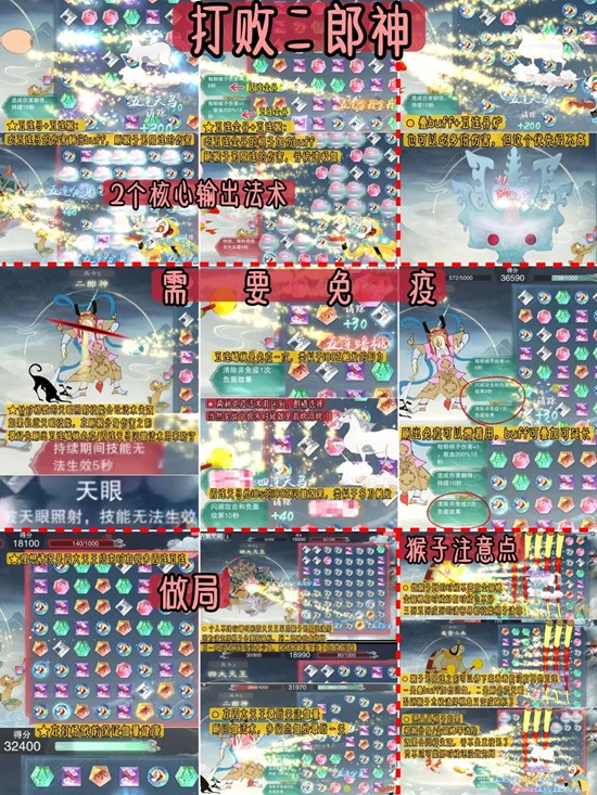 针对杨戬的天眼照射技能会让法术失效,如果临近天眼技能,在刷猴分身伤害之前最好先刷出五连蟠桃免疫/四连天马闪避法术用来防守