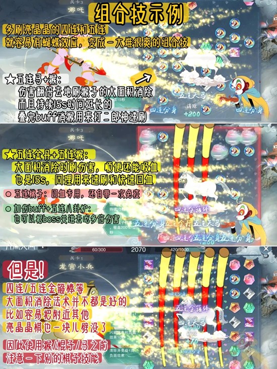 个人不建议哪吒和四大天王采用猴子无限连清屏,我之前试过,清屏一时爽,二郎神火葬场。因为清完屏棋子会重新随机,到二郎神很难做局,万一那时候刚好也没多少血,被杨戬戳几下没了很难救回来