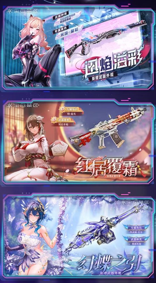 新时装包括“暗空魅影”、“清光蔼蔼”、“花间蝶踪”和“激昂旋律”等多款新时装,为角色增添更多风采,新武器新增“鸣雷戒律[突击步枪]”和“织心秘语[霰弹枪]”,参与活动限时赠送,为玩家提供更多的武器选择。