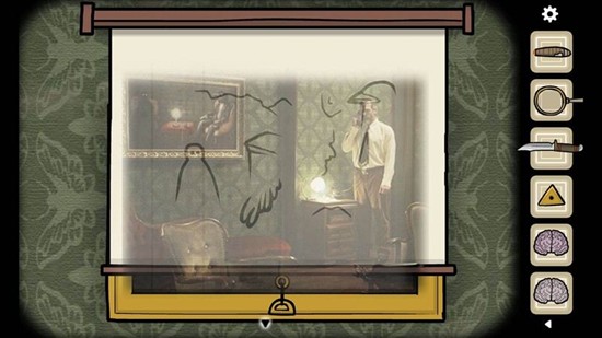 这些图形需要与投影画面中的特定物品重叠匹配,比如右侧的不规则图形与画面中男人的领带完全重合,通过这种对应关系即可解开谜题。