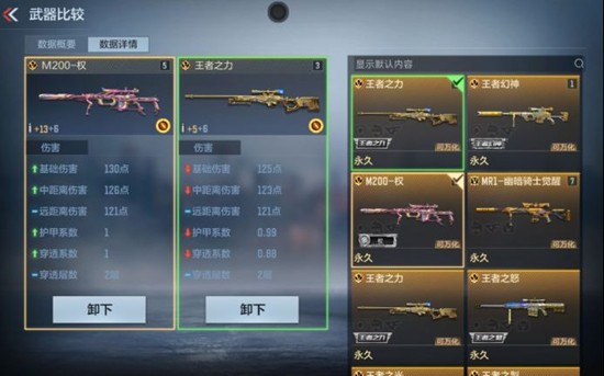 我们将M200-权与榜单第四的王者之力进行对比。基础伤害方面,M200-权基础伤害130点,中距离126点、王者之力基础伤害125点,中距离123点。M200-权在伤害数值上有明显优势,尤其是中近距离对枪时,秒杀效率更高。