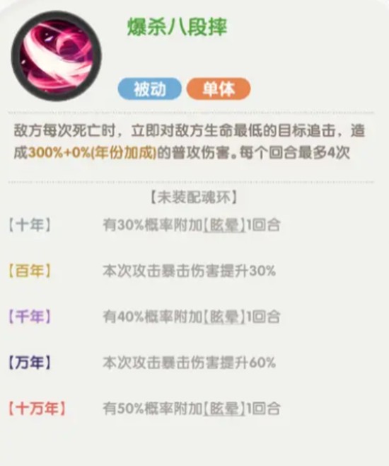 小舞的被动技能“爆杀八段摔”赋予她强大的追击能力。每当场上有一名敌人阵亡时,该效果有极高概率触发,使小舞立即对敌方当前血量最低的单位发动一次额外攻击。每回合最多可触发四次,这意味着在顺风局或多单位阵亡的情况下,小舞可以连续进行多次追击输出,形成滚雪球效应,进一步扩大优势。