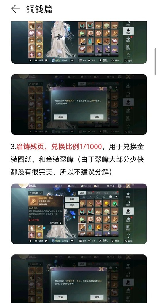 3.冶铸残页,兑换比例1/1000,用于兑换金装图纸,和金装翠峰(由于翠峰大部分少侠都没有很完美,所以不建议分解)