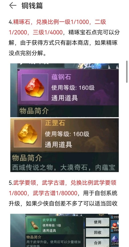 5.武学要领,武学古谱,兑换比例武学要领1/8000,武学古谱1/80000,用于自创系统升级,如果少侠自创差不多了可以适当回收