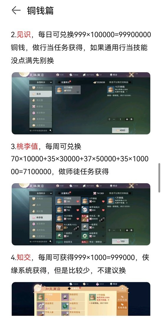 2.见识,每日可兑换999x100000=99900000铜钱,做行当任务获得,如果通用行当技能