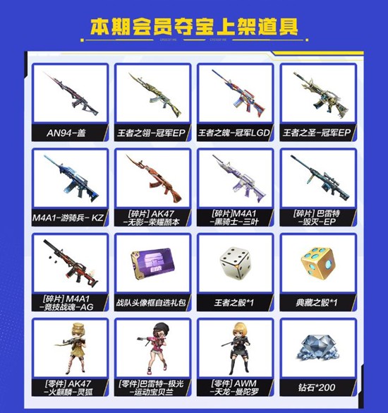 解锁会员专属夺宝奖池,道具定期轮换海量道具等你来探索,本期夺宝奖池内容包括:AN94-盖、王者之翎-冠军EP、王者之魄-冠军LGD、王者之圣-冠军EP、M4A1-游骑兵-KZ等道具。
