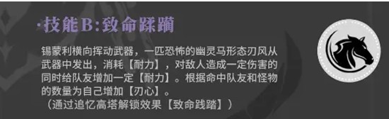 狂气深渊是一项兼具突进与爆发效果的主动技能。使用时锡蒙利侧身冲刺接横斩,迅速接近目标并造成三段伤害。最关键的是,一旦命中敌人的破绽部位,便会立即触发开刃状态。该状态是后续强化输出的重要前置条件,也是高水平玩家争夺战斗主动权的核心节点。配合后续技能追忆高塔解锁的绝命深渊与绝命炼狱,在面对高血量Boss时也能打出成吨伤害,显著提升战斗效率。