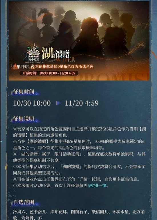 重返未来:1999玩家可以在指定的角色范围内自主选择并锁定3位6星角色作为当期【湖的馈赠】征集的定向邀请角色。当在【湖的馈赠】征集中获取6星角色时,100%的概率为玩家锁定的6星角色之一。每个锁定的6星角色的获取概率均等。那么此次卡池应该抽取什么角色呢?小编为你准备了一份攻略,一起来看看吧~