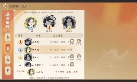在忘川之中,有一群“四季之灵”,它们可以创造四季景象,时之涯,这里有4个季节,每天最多可以挑战6次。在挑战不同的季节时,必须要带特定的朝代名士才可以,那么时之涯夏12应该怎么配队呢?小编为你准备了一份攻略,一起来看看吧~