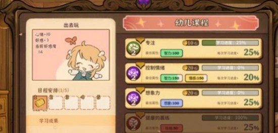 学习自理是火山的女儿中父亲目标的第一项任务,需要陪伴女儿完成三门课程的学习。每一门课程都必须将进度提升至100%才算完成,若能让课程属性达到最佳状态,还可额外获得25%的进度加成,加快整体任务效率。比如选择礼仪课时,需持续参与课程互动,跟随教学节奏逐步积累经验。当一门课程完成后,建议不要立即开启下一项,而是带女儿去玩秋千放松心情,这不仅能缓解压力,还能提升亲子好感度,为后续任务打下良好基础。