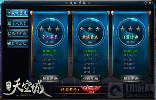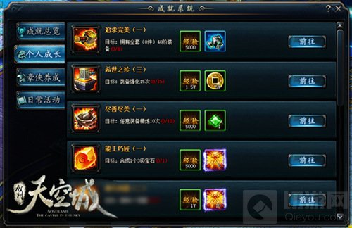 其实玩家们在游戏里的战斗、竞技、PK等都可能正在慢慢地完成某个成就。《九州天空城》同名精品页游的“成就系统”总共分为三个大项目:“个人成长”“豪侠养成”“日常活动”,而每一个大项目下面,又有许多小项,比如“个人成长”中主要偏重对于装备、时装、神器等培养…
