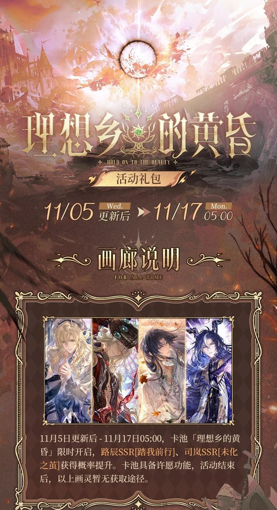 11月5日更新后 - 11月17日05:00,卡池「理想乡的黄昏」限时开启,路辰SSR[踏我前行]、司岚SSR[未化之茧]获得概率提升。卡池具备许愿功能,活动结束后,以上画灵暂无获取途径。
