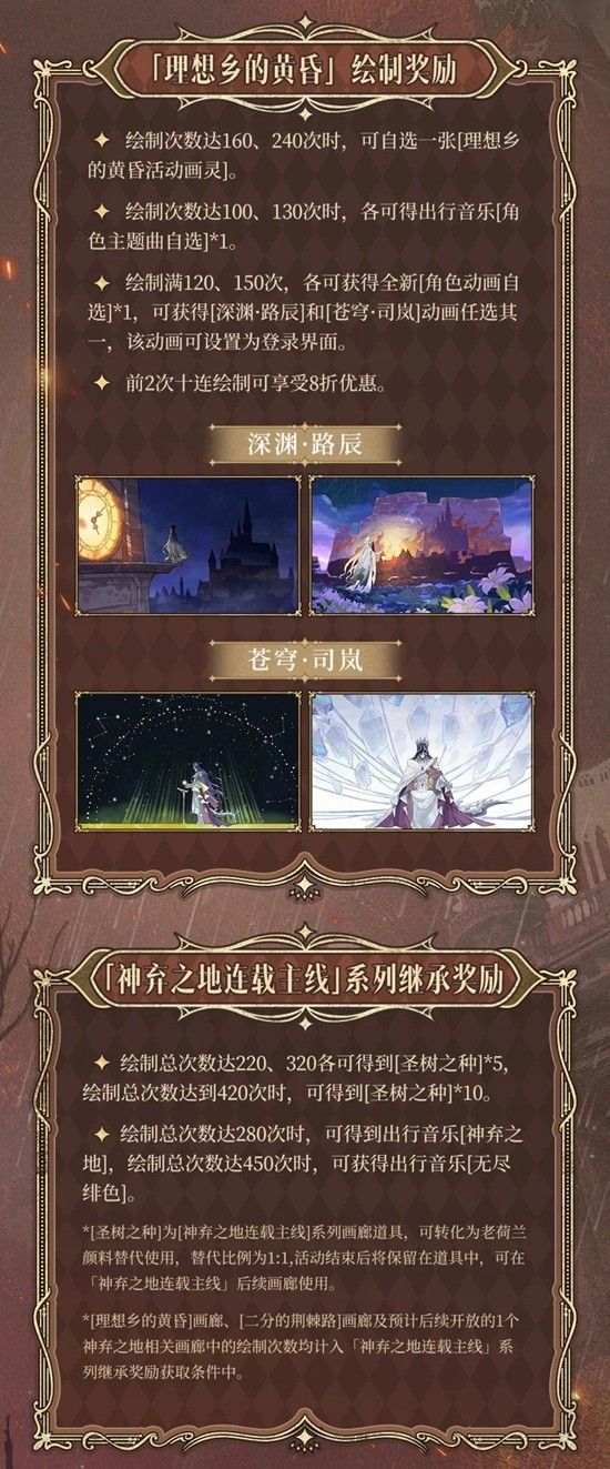 *[理想乡的黄昏]画廊、[二分的荆棘路]画廊及预计后续开放的1个神弃之地相关画廊中的绘制次数均计入「神弃之地连载主线」系列继承奖励获取条件中。