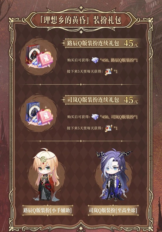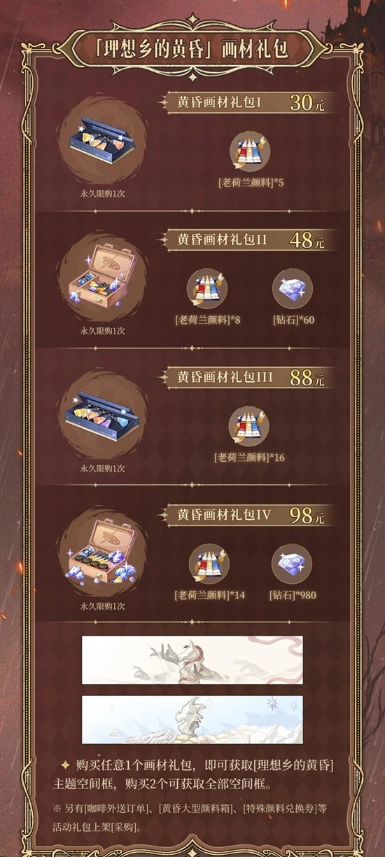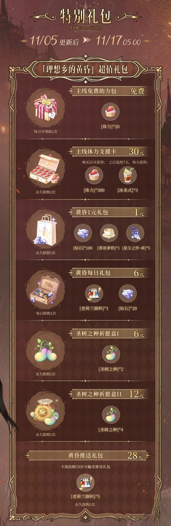 「理想乡的黄昏」相关礼包上架,详情可查看图片。