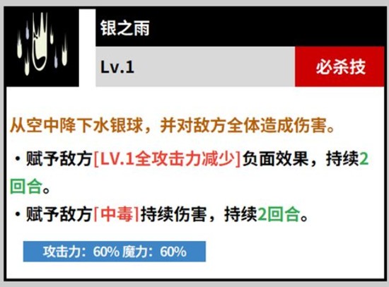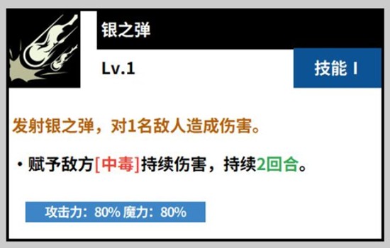 诺杰尔的一技能名为银之弹,是其主要的起手技能之一。该技能可对单体敌人造成远程伤害,并有一定概率附加中毒状态。中毒效果可持续两个回合,期间目标每回合都会受到持续伤害,同时攻击力会逐步下降。由于该技能冷却时间较短且使用频率高,常被用于战斗初期为敌方施加负面状态,为后续技能衔接创造条件。在黑色四叶草魔法帝之道的对战节奏中,银之弹是触发连环控制的关键起点。