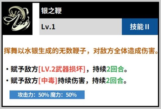 诺杰尔的二技能银之鞭为范围攻击技能,能够对多个敌人造成群体伤害。在命中目标后,除了基础伤害外,还会施加武器损坏效果,使敌方后续造成的伤害降低。该减益状态同样持续两个回合,配合中毒状态可大幅削弱敌方输出能力。银之鞭在面对复数敌人时表现尤为出色,既能清场又能维持控制链,在黑色四叶草魔法帝之道的团战或推图过程中具有重要战略价值。