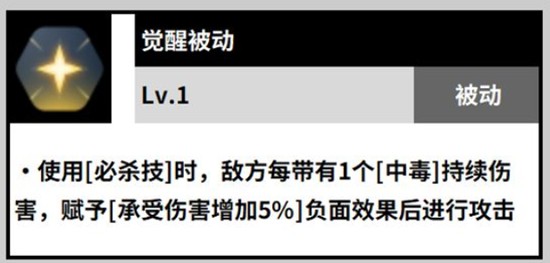 诺杰尔的被动技能在战斗中起到持续强化作用。当SP值达到3点及以上时,自身会获得15%的强韧加成,提升生存能力。觉醒被动则与大招联动,每当敌人身上的中毒层数存在时,诺杰尔对其造成的伤害将进一步提升。每层中毒可增加5%的受击伤害,若被动升至2级,还可额外触发10%的易伤效果。这一机制让诺杰尔在叠加中毒层数后,能显著提升全队的输出效率。