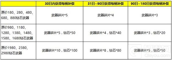 同时为了答谢勇士对《自由之战》的支持,官方会对自版本更新开始计算近180日内获得武器的勇士做出一定补偿,补偿方式如下: