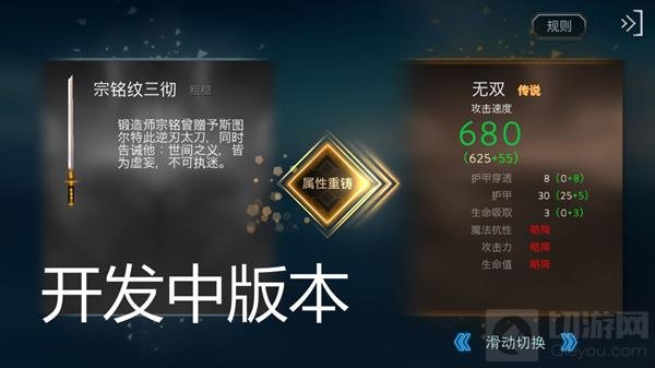 2、图内左半部分为需要重铸的武器,右半部分为希望重铸的属性,可以滑动屏幕右下方更换。确认要重铸的属性后,点击屏幕中央的属性重铸按键。