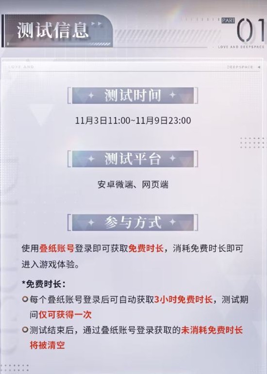 使用叠纸账号登录即可获取3小时免费时长,消耗免费时长即可进入游戏体验。测试平台包括网页端(iOS、安卓、PC)和安卓微端(建议预留120MB存储空间)。