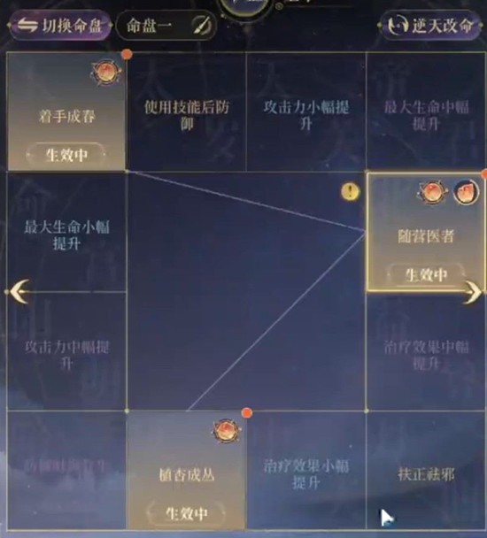 着手成春是强化治疗效果的命盘,能够提升董奉的治疗能力,在代号鸢的团队作战中作用显著。如果队伍中已有防御型角色,搭配植杏成丛效果更佳;而在面对高伤害敌人时,选择着手成春能更好地保证队伍的生存。