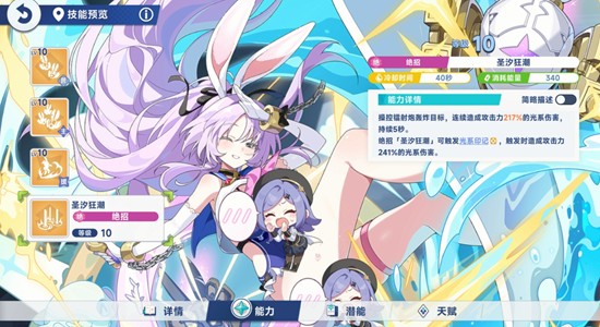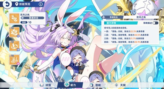 希娅的技能组决定了她最适配主控位,尽管拥有倍率尚可的援助技碧波轮奏,但若将其置于援助位将损失普攻与主控技带来的大量输出机会。由于缺乏辅助队友的能力,希娅难以胜任功能性辅助角色。在实际配队中,玩家可根据战斗需求选择雪兔流或夜兔流两种潜能路线:前者以霁雪化刃、幻步临光、雪域压制为核心,强化单体穿透;后者依赖月华倾泄、星舞追跃、月能爆裂,提升范围压制力。两种流派各有优势,可根据关卡特性灵活切换。