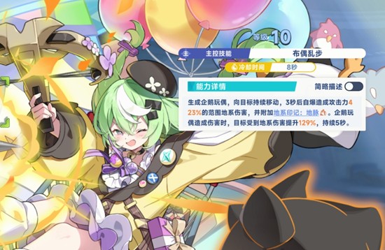 释放技能后,小禾会在场上放置一个企鹅玩偶,该玩偶将锁定目标并缓慢靠近,在三秒延迟后发生爆炸,对范围内敌人造成地系伤害。爆炸不仅会使敌人陷入“地系伤害提升”的减益状态,还会为其附加地系印记。这一印记可被队友的特定技能引爆,从而触发额外伤害加成。此机制让小禾在主控状态下也能为后续角色创造输出环境,具备一定的辅助潜力,但仍不足以支撑她成为主力输出核心。