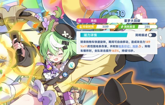 小禾的绝招开启后,她将驾驶购物车在场内高速旋转移动,持续对范围内的敌人造成地系伤害,并为所有被击中的目标施加地系印记。技能结束时购物车发生爆炸,同时为全队提供攻击力增益,持续时间长达15秒。由于该增益覆盖范围广且持续时间长,非常适合在面对高血量BOSS类敌人时释放,确保队友能完整享受加成。配合印记机制,还能为队伍中的地系爆发角色创造极佳的输出窗口。