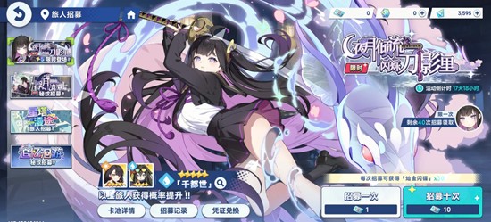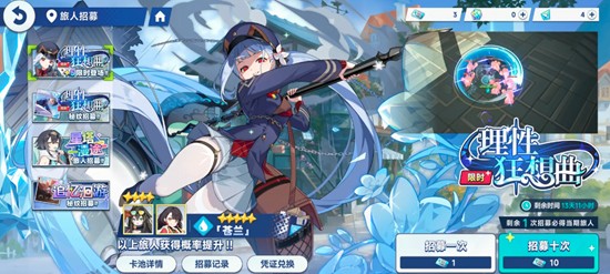限时卡池通常围绕特定角色推出,包含限定五星及四星角色,只能通过青空礼券抽取。该卡池同样拥有1.6%的五星基础掉落率,并设有独立的160次抽卡保底机制。即在累计抽取160次后仍未获得五星角色时,系统将强制发放当期限定五星角色。此外,每次抽到五星角色时,有60%的概率为本期UP角色;而四星角色中也有50%概率为当前限定四星角色。