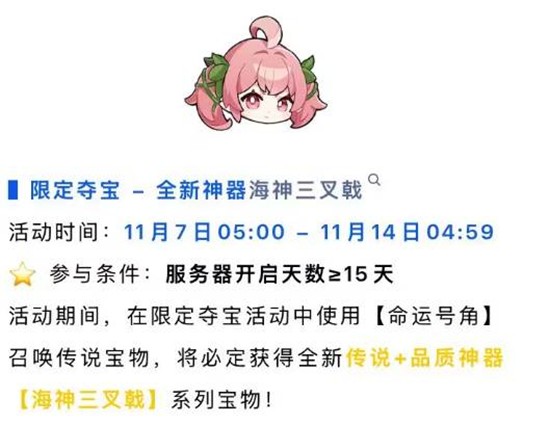 在活动期间,勇者们可以通过使用【命运号角】召唤传说宝物,必定获得全新传说+品质神器【海神三叉戟】系列宝物之一。此外,每50次夺宝必得【海神三叉戟】系列宝物之一!