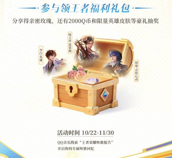 另查看你的「峡谷音缘」英雄>>分享即可领取钻石和亲密玫瑰 ,参与更多玩法,赢取2000Q币&英雄皮肤~惊喜福利等你来拿~