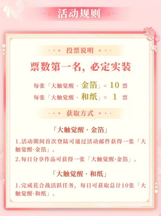 11月5日维护后至11月11日23:59,这是游戏内投票阶段,玩家们的每一票都至关重要,快来为自己喜爱的作品投票应援吧!
