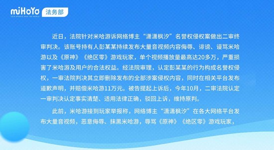 近日,米哈游公司针对网络博主“潇潇枫汐”的名誉权侵权案件取得了法律胜利。该博主因持续发布侮辱、诽谤米哈游及其旗下游戏《原神》和《绝区零》的视频内容,被法院判决构成名誉权侵权,并被判赔偿米哈游11万元。