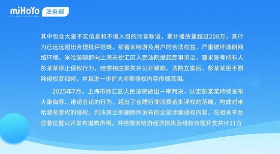 案件回顾 “潇潇枫汐”在其网络平台上发布了大量含有不实信息和污言秽语的视频,累计播放量超过200万次,严重损害了米哈游及其用户的合法权益,破坏了网络环境的清朗。米哈游在接到玩家举报后,立即向上海市徐汇区人民法院提起民事诉讼,要求该博主停止侵权行为,赔偿相应损失并公开致歉。