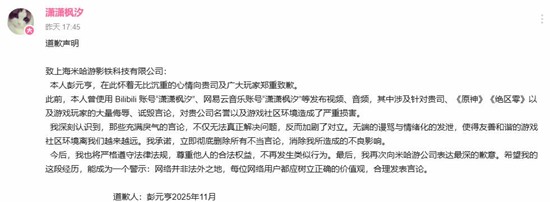 目前,“潇潇枫汐”已在相关平台发布了道歉声明,并向米哈游支付了赔偿金。表示已经深刻认识到,那些充满戾气的言论,不仅无法真正解决问题,反而加剧了对立。无端的谩骂与情绪化的发泄,使得友善和谐的游戏社区环境离我们越来越远。
