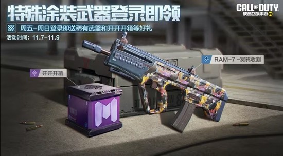 11月7日(本周五),周末登录礼活动来袭。战士们周末登录游戏,即可获得稀有级武器RAM-7-冥鸦收割、开开开箱和福利点券。