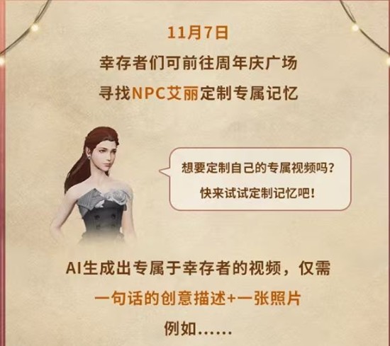 11月7日,《明日之后》七周年庆典将正式开启。玩家可以前往周年庆广场,寻找NPC艾丽定制专属记忆。这不仅是一次游戏内的特殊活动,更是一次情感上的共鸣,让每位玩家都能在游戏中找到属于自己的那份感动。