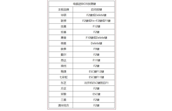 注意:各个主板品牌的BIOS启动按键不同,玩家可查看下图整理的信息或者百度搜索自己主板品牌BIOS启动按键。