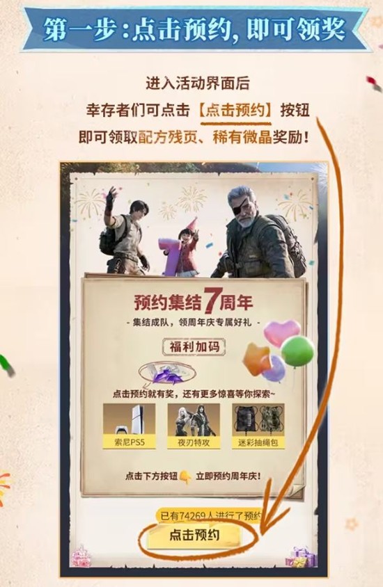 集结好友,与大家一起参与七周年庆典!幸存者可选择创建队伍,或加入好友队伍,与好友一同领取游戏道具等奖励!